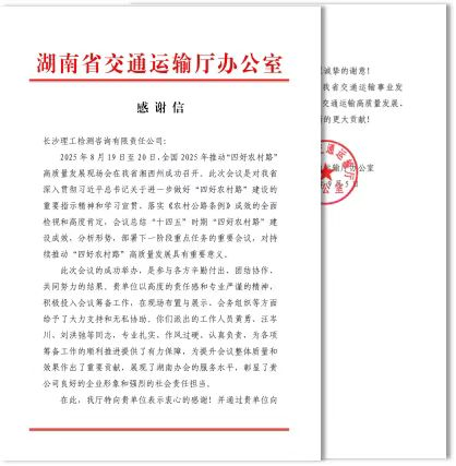 近日,长沙理工检测咨询有限责任公司收到湖南省交通运输厅办公室发来的感谢信。信中对检测公司在全国2025年推动“四好农村路”高质量发展现场会中所作出的突出贡献表示高度认可与衷心感谢。