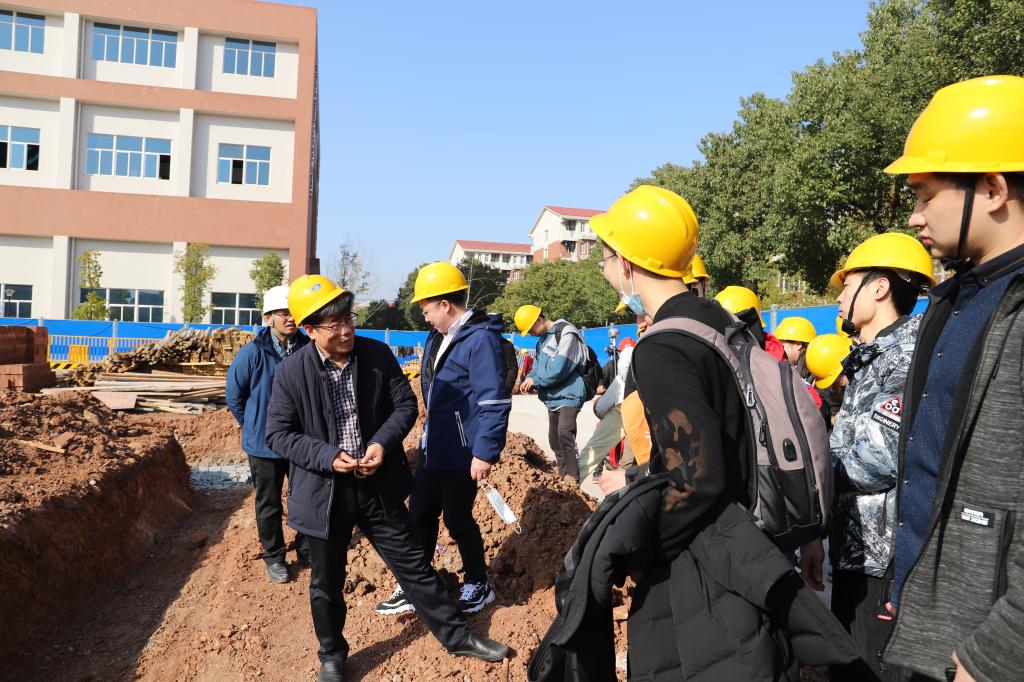 1月15日,土木学院17级本科生在柳厚祥教授等教师的带领下走进工训中心、基础中心项目工地开展毕业见习,这也是MG冰球突破官网中西部二期(工训中心、基础中心)项目迎来的首批见习生。