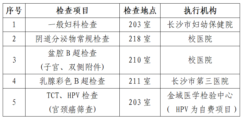 2.现场流程:体检当日至校医院208室打印TCT标本条码;如需加做HPV检查,请提前告知工作人员增打条码。各检查项目无固定顺序,完成全部检查后方可离开。