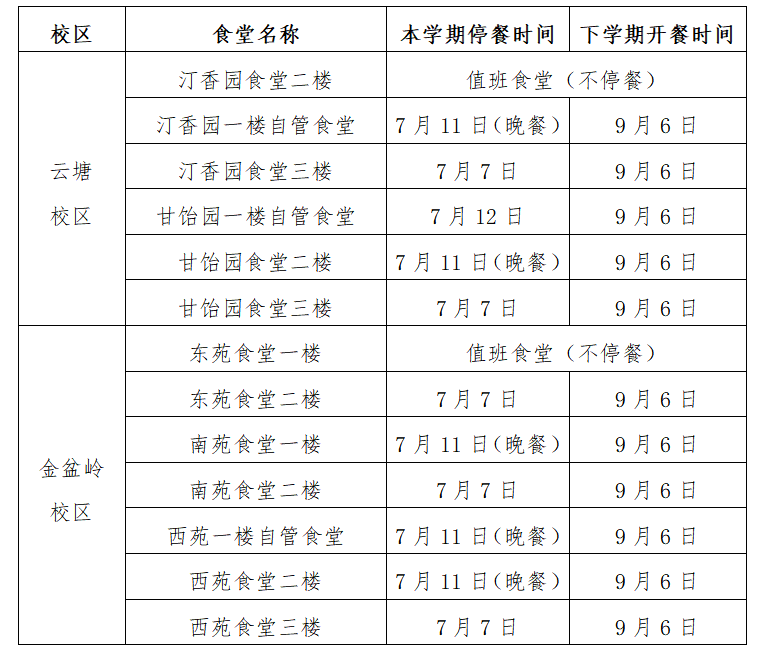 临近放假,学生陆续离校,为保障暑期师生正常用餐,学校各食堂停、开餐安排如下: