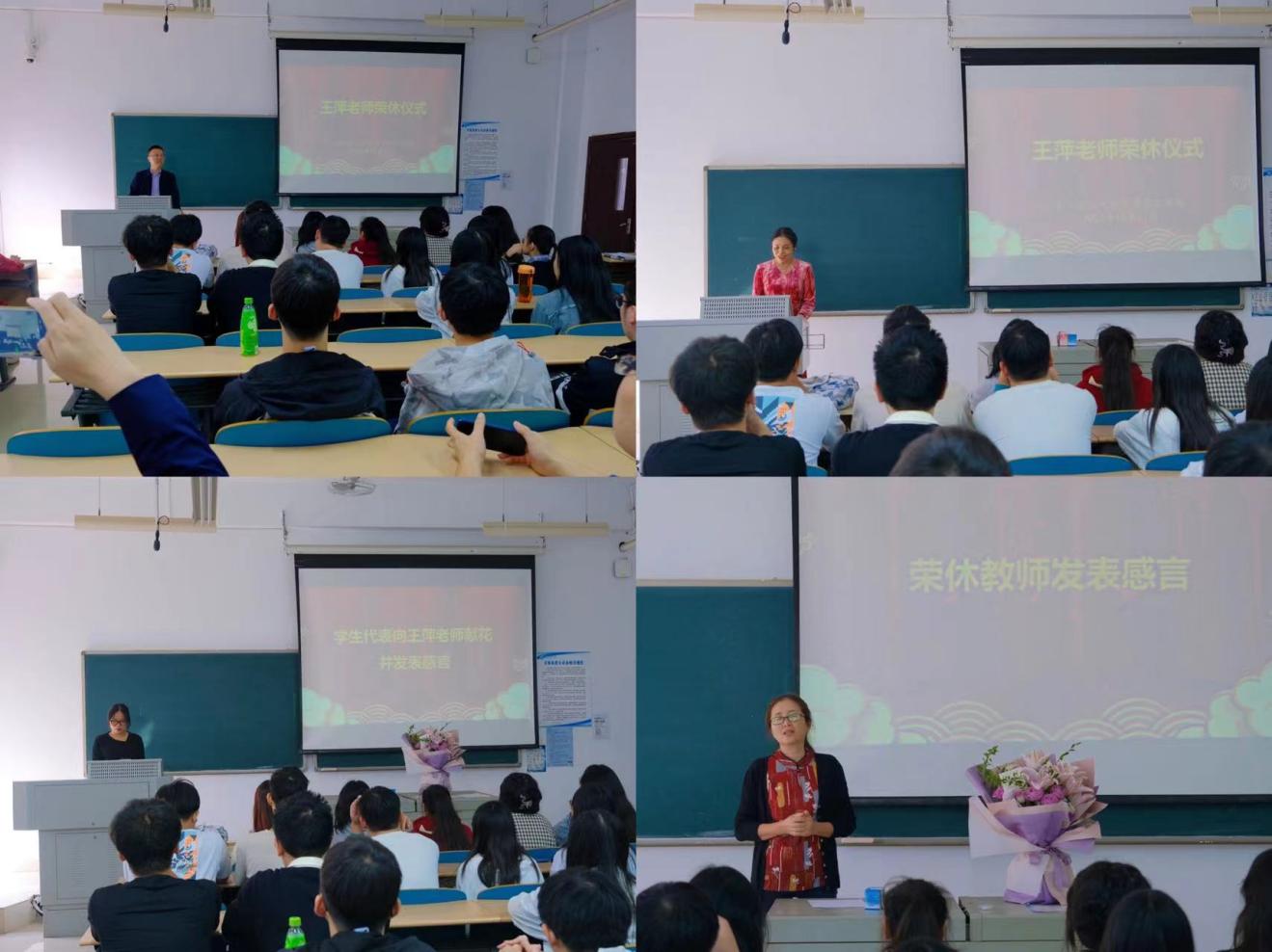 宋刘斌高度评价了王萍老师在教书育人方面的突出贡献,指出荣休教职工既是学院事业发展的建设者,又是学院创业历史的见证者,是学院无形和无价的宝贵财富,王萍老师从教整整31年,把美好的青春、智慧和才华贡献给了学校,培养了大量优秀人才。宋刘斌代表学院衷心祝愿王老师保重身体、安享幸福,在新的人生旅程中收获更大的喜悦,常回“家”看看。