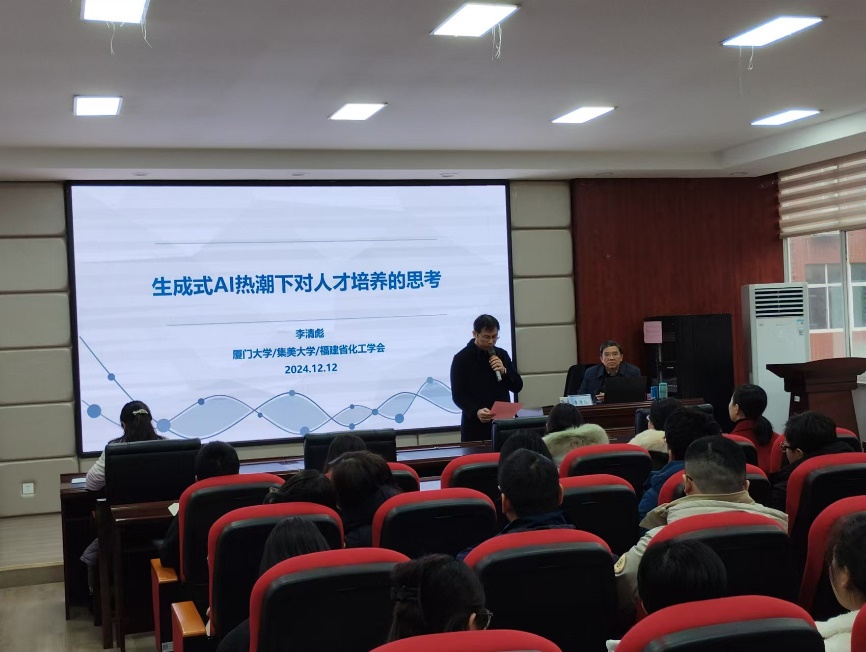 2024年12月12日下午,集美大学原校长李清彪教授应邀莅临化学化工学院进行学术交流与讲学,在工三A320报告厅作了题为“生成式AI热潮下对人才培养的思考”的报告。报告由学院院长张跃飞教授主持,副院长陈启杰、喻林萍以及学院教师、本科生与研究生共100余人参加了学术报告会。