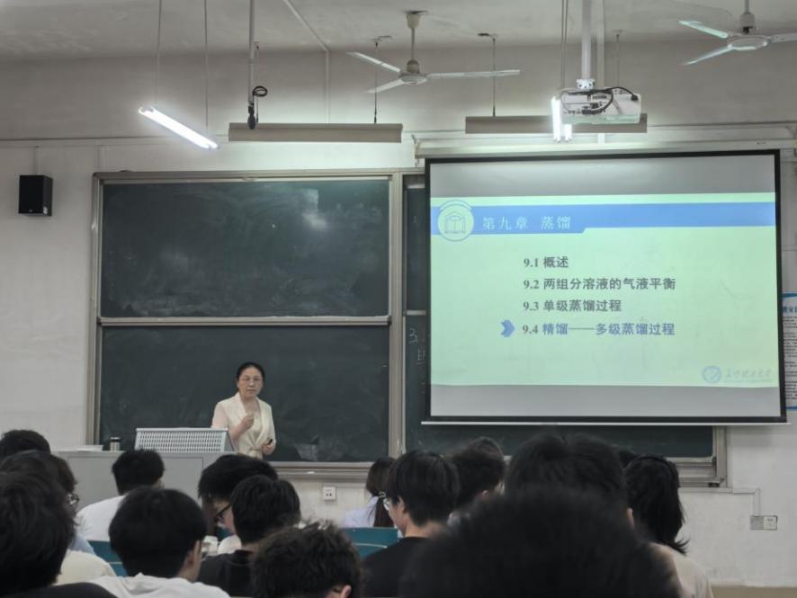 本次示范课聚焦《化工原理》中的核心内容“精馏——多级蒸馏过程”。黄灵芝副教授以我国著名化工专家余国琮院士分离重水的重大科学贡献为切入点,将厚重的学科历史与前沿的工程应用巧妙融合,瞬间点燃了课堂。她通过清晰严谨的推演,生动阐释了精馏过程的科学本质;结合精馏塔结构的可视化剖析,将复杂的工程设备原理转化为学生易于理解的知识脉络。整堂课设计精妙,理论紧密联系工程实践,展现出深厚的教学功底与鲜明的教学创新特色。