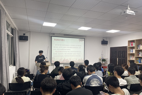 活动伊始,支部党员陈锦城以《两会精神与青年使命》为题,为在场师生带来一堂生动的专题党课。他从两会的历史意义切入,结合科技创新、教育改革、绿色发展等核心议题,系统解读国家战略布局,并重点剖析两会报告中对化学医药领域的政策导向。“科技创新要‘顶天立地’——既要突破‘卡脖子’技术,也要服务民生需求。”陈锦城以深入浅出的语言,将宏观政策与学科发展紧密结合,引发师生共鸣。