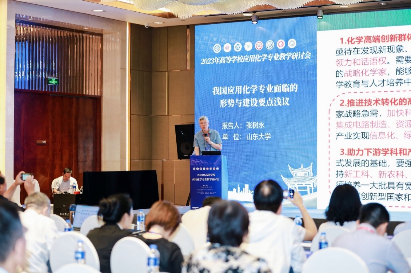 教育部化学类专业教学指导委员会委员兼应用化学协作组组长、山东大学教学促进与教师发展中心主任兼本科生院副院长张树永教授做了《我国应用化学专业面临的形势与建设要点浅议》的总结报告,分析了应用化学专业的建设形势和重点,肯定了国内应用化学专业在大家的共同努力下不断取得的长足进步,并强调我国化学学科目前正处于抢占科技前沿和战略制高点的关键期,希望大家凝心聚力,在夯实专业规范化建设的同时,将具有自身特色的应用化学专业做大做强,不断强化应用化学专业的教学改革和教学建设。