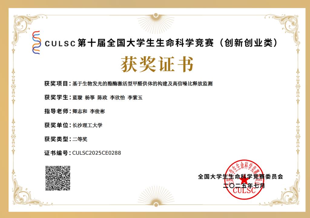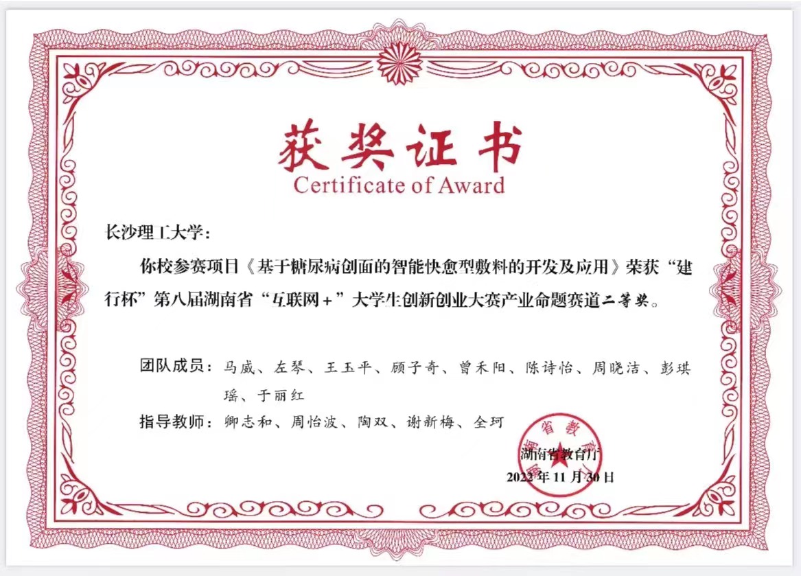 获奖等级:“建行杯”第八届湖南省“互联网+”大学生创新创业大赛研究生创意组/高教主赛道 二等奖
