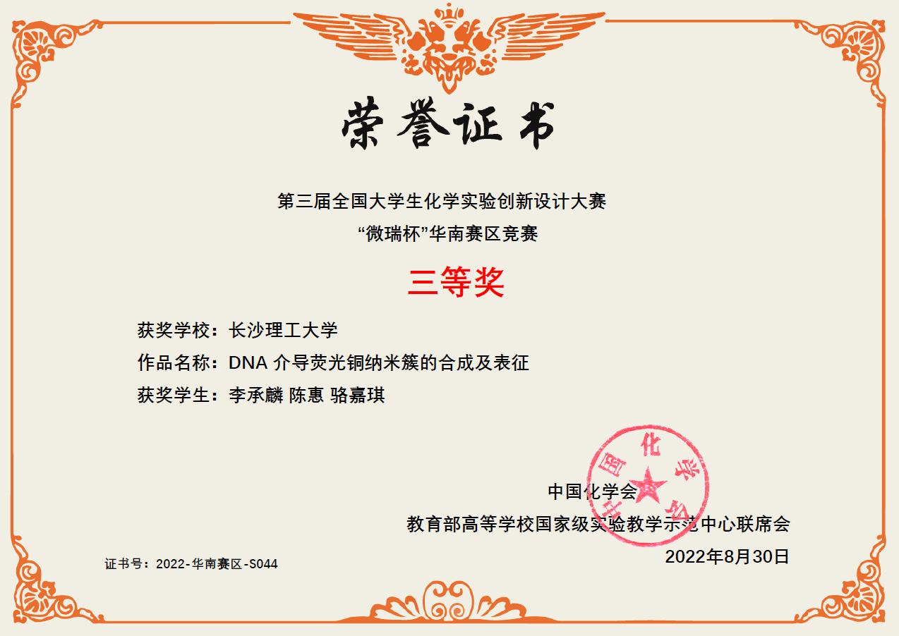 获奖等级:第三届全国大学生化学实验创新大赛华南赛区三等奖