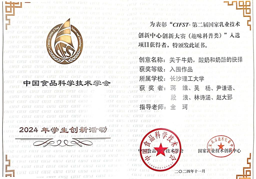 颁奖部门:中国食品科学技术学会
