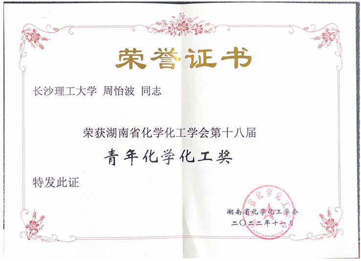 获奖等级:湖南省化学化工学会第十八届青年化学化工奖