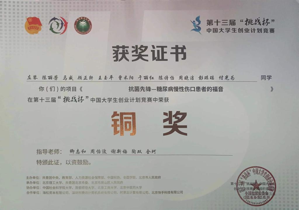 获奖等级:第十三届“挑战杯”中国大学生创业计划竞赛 铜奖