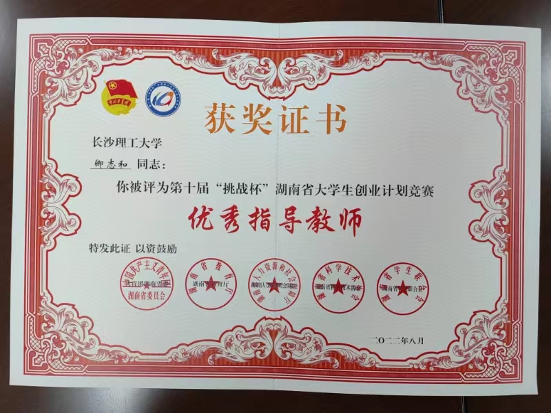 获奖等级:第十届“挑战杯”湖南省大学生创业计划竞赛 优秀指导教师