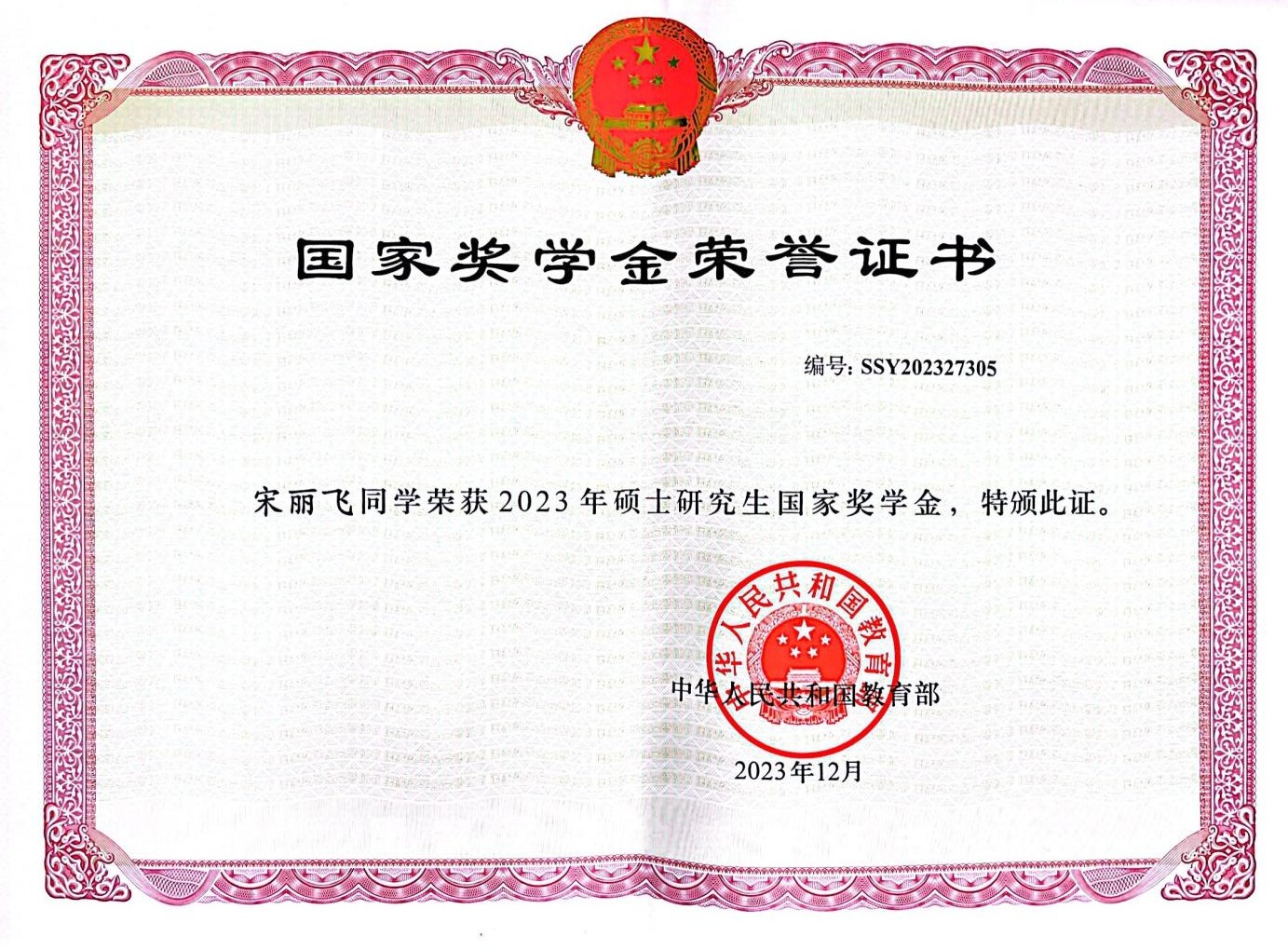 获奖等级:2023年硕士研究生国家奖学金