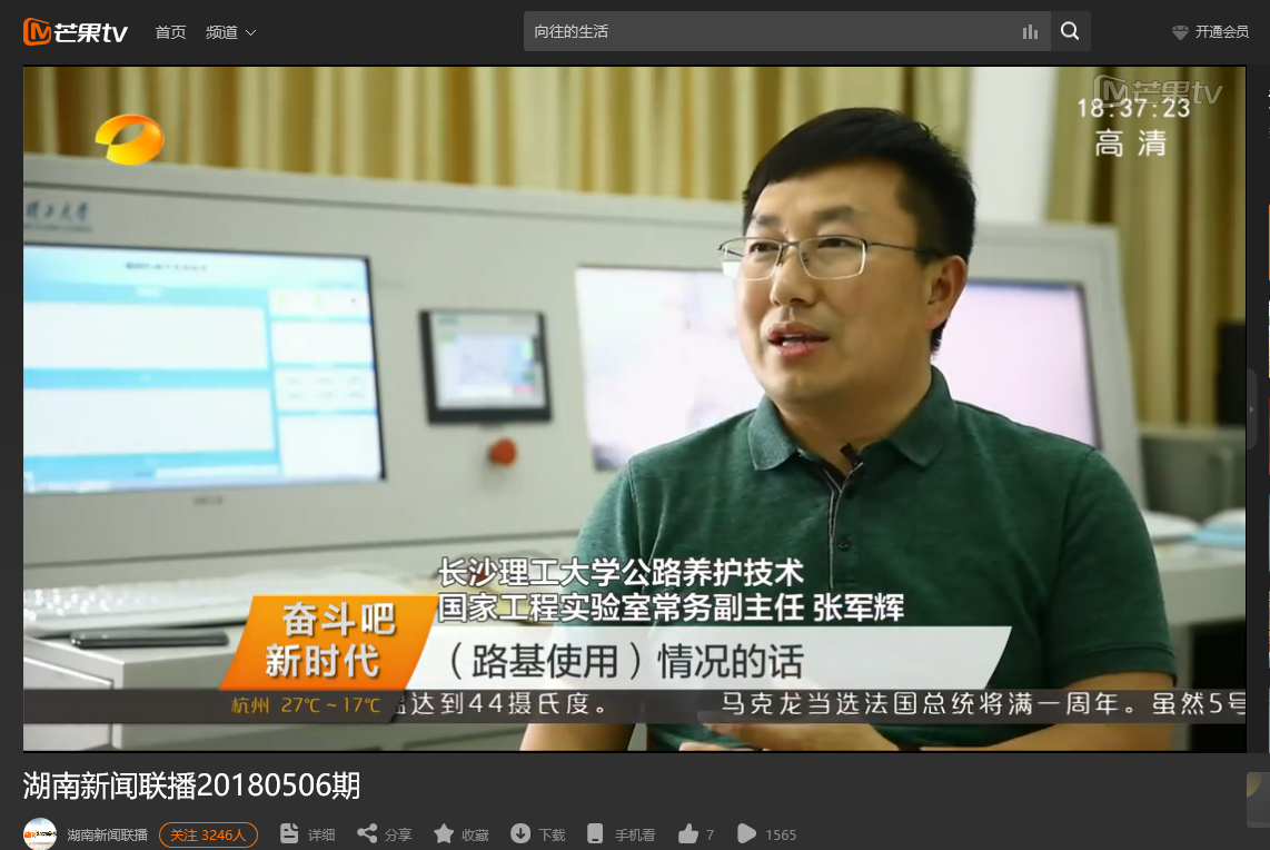 湖南卫视2018年5月6日新闻联播7分20秒处,对MG冰球突破官网高速公路改扩建关键技术进行了报道,MG冰球官网交通学院刘朝晖教授主持的“南方湿热地区高速公路路基改扩建关键技术及应用”获湖南省科学技术进步奖一等奖。该项目通过路基长期稳定性保障、新老路基非均匀沉降控制、拓宽路基下地基处治、旧路路基性能检测评价与加固等技术集成与创新,攻克了南方湿热地区高速公路路基改扩建中遇到的新路基稳定性差、新老路基非均匀沉降难以控制等技术难题。