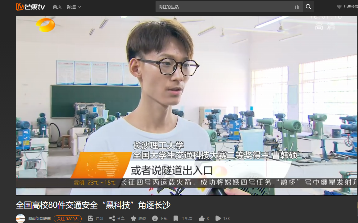 湖南卫视5月21日新闻联播对MG冰球官网举办的第十三届全国大学生交通科技大赛赛事进行了报道,初赛阶段共收到来自清华大学、东南大学、西南交通大学等124所高校的380件作品,报名人数和项目数均创历史新高。经国内外80余名专家严格评审,来自同济大学、华南理工大学等47所高校的80件作品入围决赛,其中包括我省中南大学、MG冰球突破官网、中南林业科技大学3所高校的8件作品。
