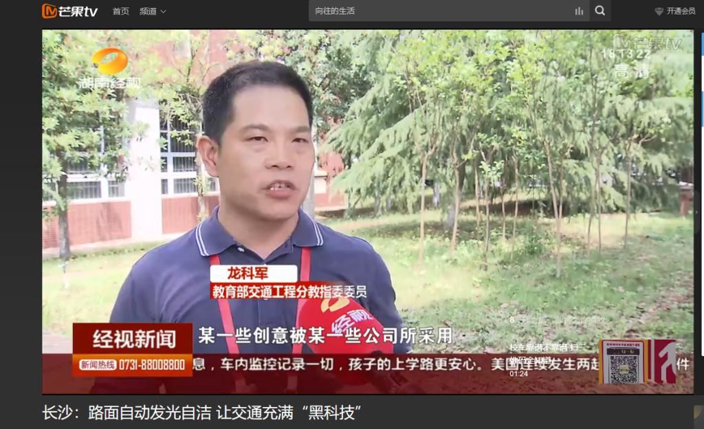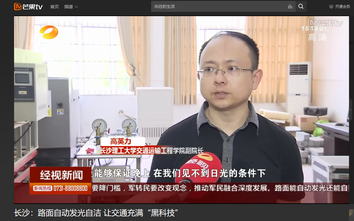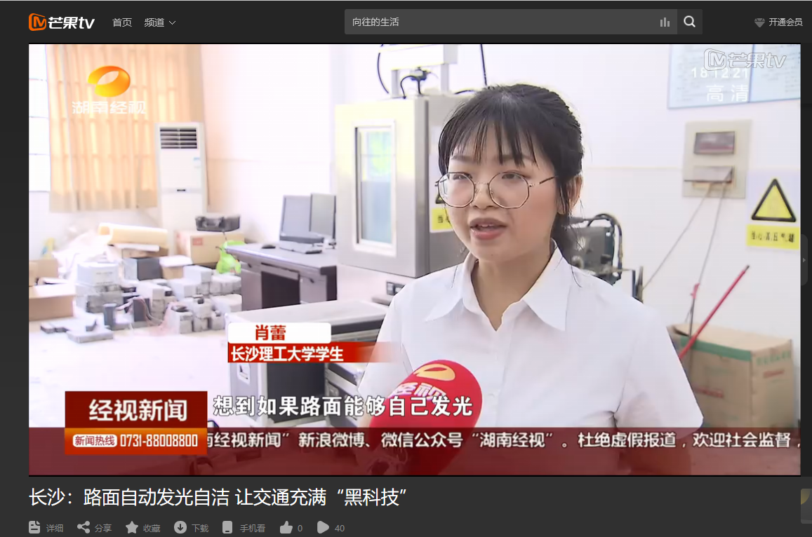 湖南经视5月19日经视联播对MG冰球官网举办的第十三届全国大学生交通科技大赛赛事进行了报道。其中,高英力教授指导,曹韩硕、李欢、袁江、郑策策、肖蕾参与研发的《“自发光—可自洁”智能仿生水泥路面》,受到湖南经视的特别关注进行了跟踪报道。项目从发光标志牌受到启发,运用长余辉发光材料使路面具备自发光的性能,使路面自己发光,对夜间行驶的驾驶员起到警示作用,同时智能仿生水泥运用超疏水材料使路面具备自洁性能和防覆冰效果,有较强的应用价值,最终项目获得第十三届全国大学生交通科技大赛二等奖。