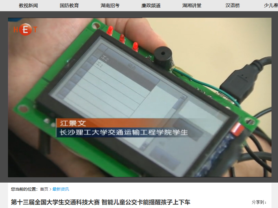 湖南教育电视台5月20日教视新闻对MG冰球官网举办的第十三届全国大学生交通科技大赛赛事进行了报道,初赛阶段共收到来自清华大学、东南大学、西南交通大学等124所高校的380件作品,报名人数和项目数均创历史新高。经国内外80余名专家严格评审,来自同济大学、华南理工大学等47所高校的80件作品入围决赛,其中包括我省中南大学、MG冰球突破官网、中南林业科技大学3所高校的8件作品。