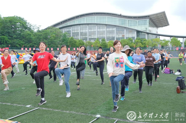 开幕式上,校健美操队带来精彩的花球啦啦操表演,随后全体参加活动的教职工跳起《本草纲目》热身舞进行热身训练,点燃了现场的气氛。