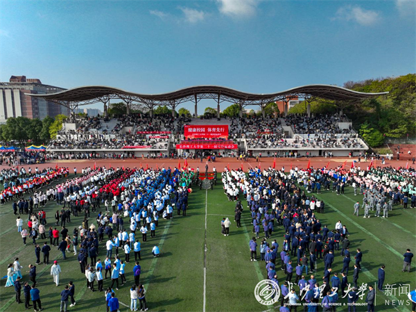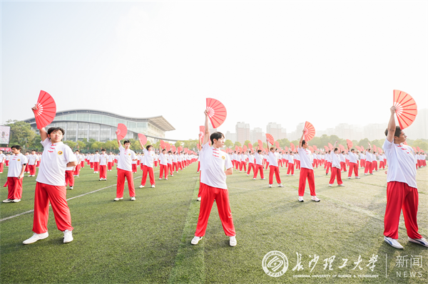 在充满动感的音乐声中,来自21个学院的1150位学生踏着音乐节拍,将跳绳与舞蹈融合在一起,为观众们带来青春活力的大型团体操表演《绳彩飞扬》。大型团体操表演《扇舞青春》紧随其后,身着太极服的同学们配合音乐开扇合扇,他们动作整齐划一,“唰”地一声齐齐将红色扇子打开,中间身着水蓝色表演服的同学们把扇子舞成了一朵朵蓝色的花……大型团体操表演融合了体育、艺术、舞蹈动作,为现场观众带来一场精彩纷呈的视觉盛宴,欢呼声与喝彩声此起彼伏。