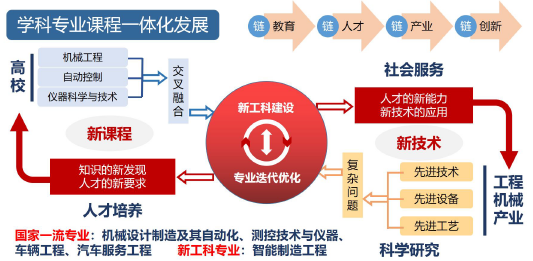 从专业、课程、教材、师资和企业实践基地入手,实现专业设置对接产业链、课程体系对接岗位链、教学内容对接技术链、教学方式对接业务链、教学方法对接生产链、双创教育对接创新链、院校合作对接人才需求链,师资引培对接人力资源链,实训基地对接产品制造链,让高校做产业真正需要的科研、育产业真正需要的人才,缓解人才供给的结构性矛盾。