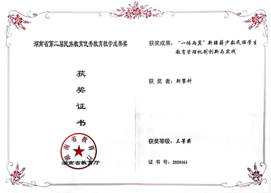 图7 “一体两翼”新疆籍少数民族学生资助育人体系创新与实践获湖南省第二届民族教育优秀教学成果奖