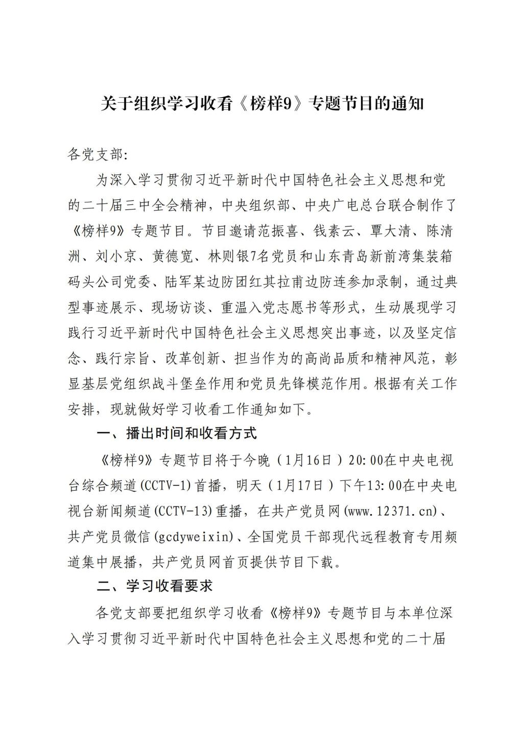 关于组织学习收看《榜样9》专题节目的通知