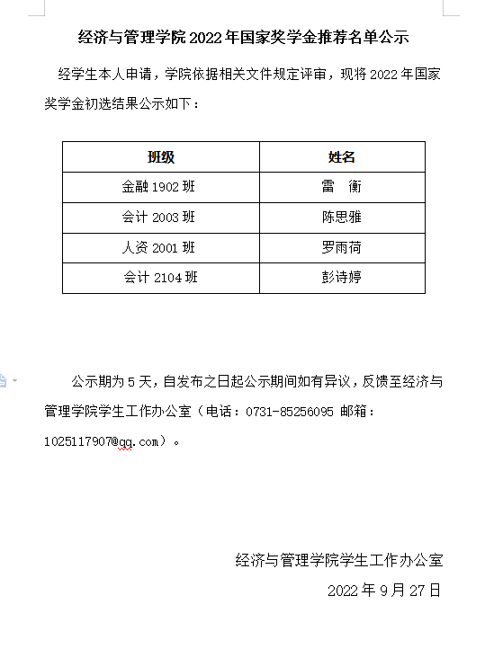 经济与管理学院2022年国家奖学金推荐名单公示