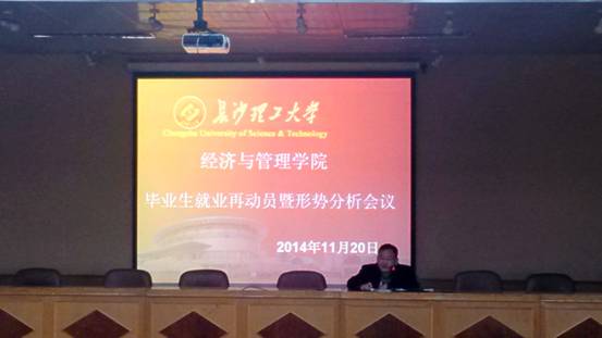 11月20日,经济与管理学院在四教报告厅召开毕业生就业再动员暨形势分析会议。经管学院党委副书记唐超文,毕业生辅导员成华、庄奕老师以及尚未签约的2015届毕业生参加会议。
