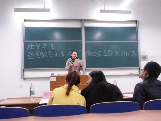 11月23日19:00,经管学院“虽是微尘,心有大爱”微公益演讲比赛在文科楼D104、D105举行。本次比赛由经管学院分团委学生会学习部主办,共有32名同学参加比赛。青志协王依然、王丽,朝闻道协会邓卓、孙雪峰担任评委。通过本次比赛将会选出8名同学参加决赛。