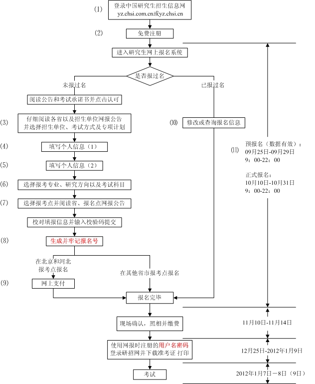 ⑽ 修改或查询自己的报名信息,其中招生单位、考试方式及报考点等信息是不可修改的内容;请在网报结束前登录确认所填信息,建议将所有信息保存;在北京和河北报考点报考的考生请检查网上支付是否成功(银行卡扣费即为成功支付);
