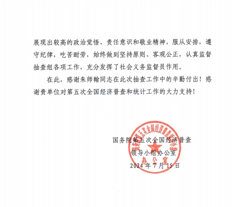 为确保普查数据的准确性和可靠性,国务院第五次全国经济普查领导小组办公室于6月下旬组织开展了经济普查事后质量抽查工作。为提高抽查工作的公开性和透明度,该办公室面向社会招募了31名社会义务监督员,朱师翰同学凭借其出色的综合素质和专业能力,成功入选并全程参与了此次抽查工作。
