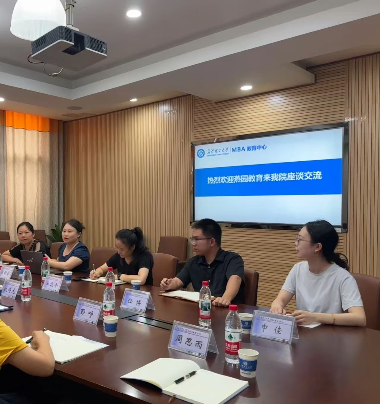 为深化教育合作、共探MBA人才培养新路径,2025年9月10日下午3点,在7号教学楼204,会议室,燕园教育机构一行莅临MG冰球突破官网MBA教育中心,围绕人才培养模式、教学资源共享、校企协同育人等核心议题展开深度交流,为双方后续合作奠定坚实基础。参会人员有燕园教育的侯昕彤、王北平、熊曦、任博、申佳老师,及MBA中心的扶缚龙主任、赖振亚老师、彭峥老师、及学生助理皮鹏、周思雨。