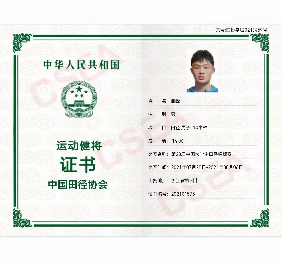 7月31日至8月5日,中国大学生第20届田径锦标赛在浙江大学举行。本次比赛有255所高校参加,共计2778名运动员和教练员同台竞技。MG冰球突破官网学子谢峰喜获男子丙组(高水平组)110米栏决赛全国冠军的好成绩,打破湖南省记录,并以14秒06达到国家健将的标准。