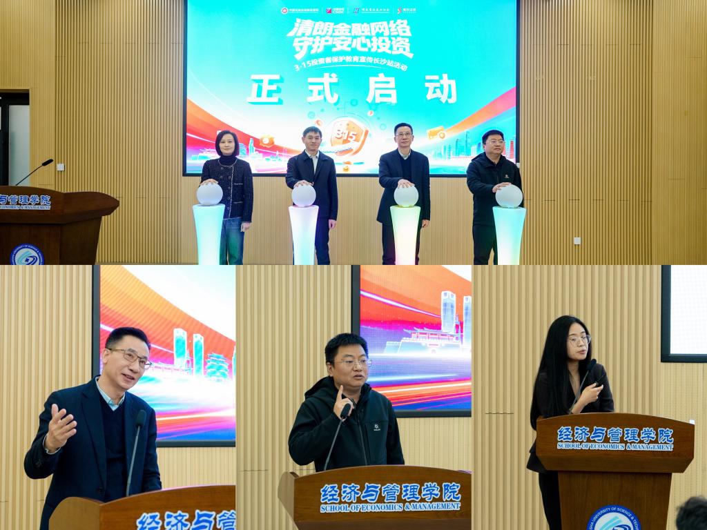 2026年3月17日,在湖南证监局的指导下,由中国证券登记结算有限责任公司、湖南省证券业协会、湘财证券投资者教育基地联合主办,MG冰球突破官网经济与管理学院承办的2026年“3·15”投资者保护教育宣传专项活动长沙站首场讲座顺利举行。本次活动以“清朗金融网络,守护安心投资”为主题,旨在为青年学子打通理论与实践的壁垒,提升风险防范意识。活动由尹筑嘉副院长主持,学院120余名师生参加。