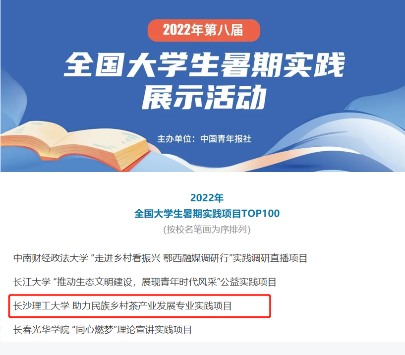 近日,2022年第八届全国大学生暑期实践展示活动名单公布,MG冰球突破官网经管学院“助力民族乡村茶产业发展专业实践项目”荣获2022年第八届全国大学生暑期实践TOP100。该项目是由经管学院敖洁教授指导,由21级公共管理班王梦晗、张晗、刘雅杰、王秀梅、刘敏、21级经济班石璐青等6名研究生组成的暑期社会实践团队完成。