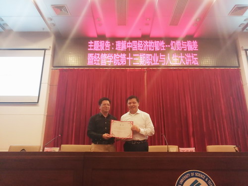 讲座伊始,王宏表达了对丁安华的热烈欢迎,并向同学们介绍他在经济领域上取得的成就,并代表学院向校友颁发了校外合作导师聘书。