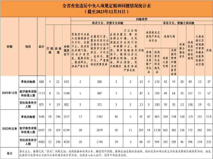 2023年1-12月,全省各级纪检监察机关共查处违反中央八项规定精神问题3546起,批评教育帮助和处理6547人,其中给予党纪政务处分4483人,占处理人数的68.5%。