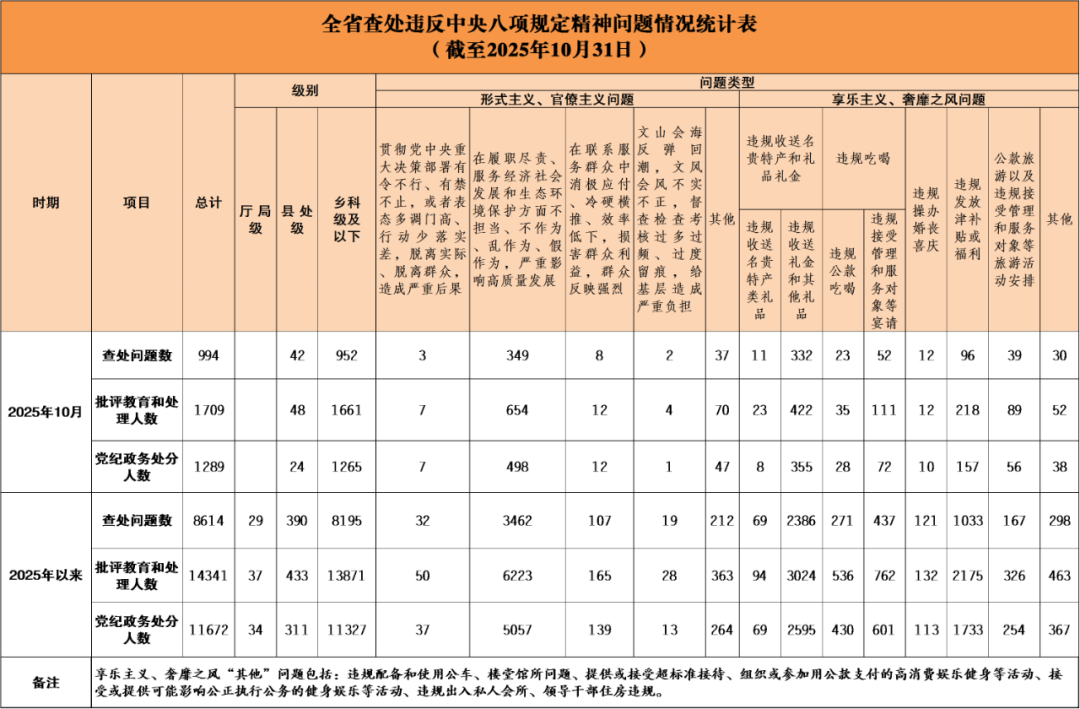 湖南省纪委监委深入贯彻中央纪委国家监委工作部署,在全省各地各部门各单位建立了落实中央八项规定精神情况月报制度。2025年以来,截至10月31日,全省查处违反中央八项规定精神问题情况如下: