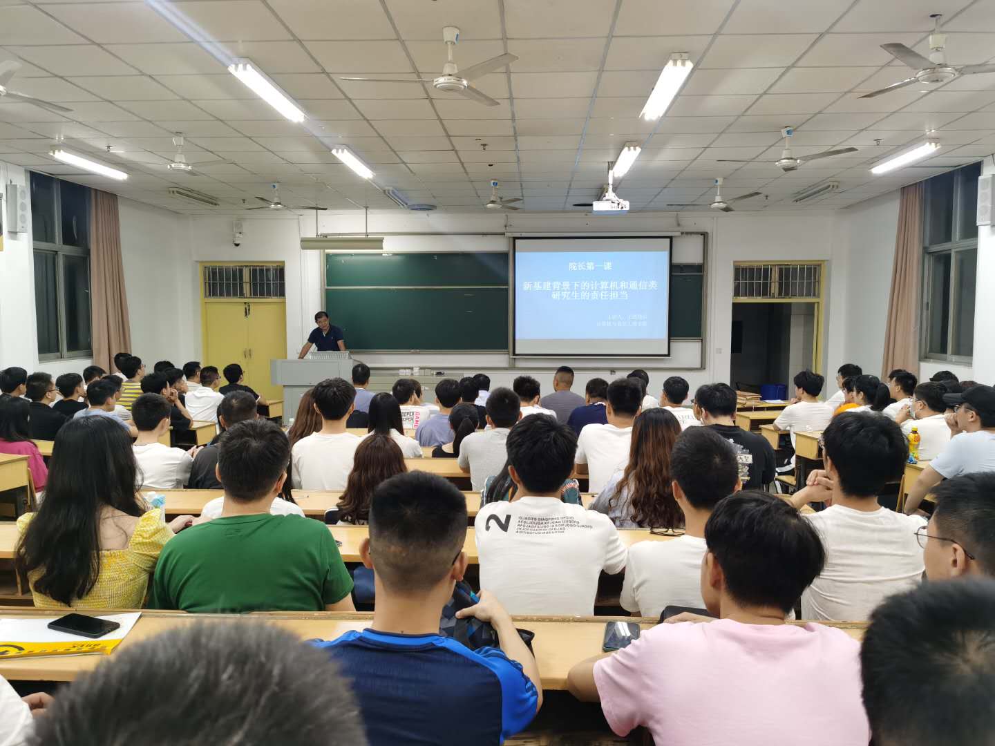 初秋九月的长理,清爽恬静。为帮助研究生新生树立人生目标、不忘考研初心,铸就追求卓越、潜心研究的品格,计算机与通信工程学院9月14日晚在金盆岭校区一号教学楼A201,开展了研究生新生入学教育之“院长第一课”,主题为“新基建背景下的计算机和通信类研究生的责任担当”。院长王进教授、副院长张建明教授以及辅导员易亭亭老师出席此次会议,2020级全体研究生参加。