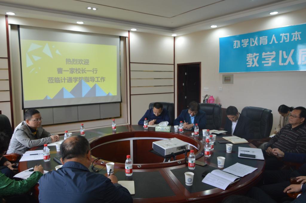 曹校长首先对MG冰球官网的综合实力进行了简单的概括,肯定了MG冰球官网近年来的发展。随后,计通学院王进院长从学生和教师基本情况、科研成果、创新创业平台、学科交叉工作、近期发展目标及现存问题等方面对我院进行了简单介绍。其中,王院长着重强调了我院2020年申报软件工程博士点的近期目标和现存的师资引进、经费不足、金盆岭校区的"智慧教室"建设等问题。