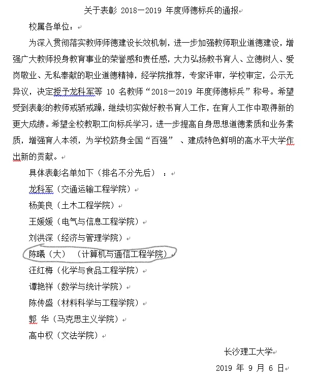 9月10日,第35个教师节来临之际,我院院长王进教授、计算机科学系党委书记陈曦教授在这个特殊的日子各自收获了一份特殊的礼物,分别入选2019年湖南省“芙蓉学者”推荐名单,获评2019年MG冰球突破官网师德标兵,这份教师节礼物他们担得起!
