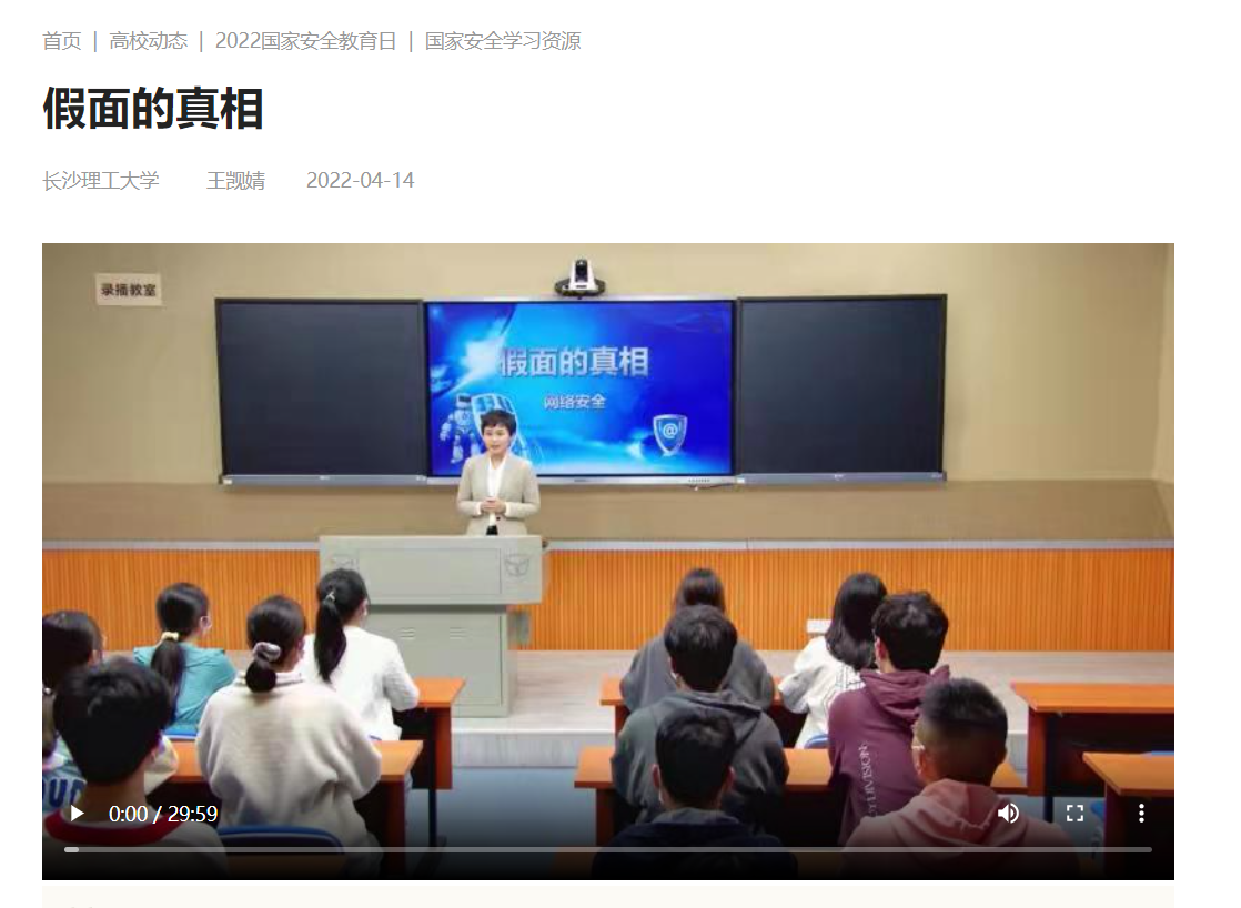 为贯彻落实《教育部思想政治工作司关于组织开展2022年全民国家安全教育日宣传教育活动的通知》,树牢国民安全意识,进一步推动国家安全观深入人心、落地生根,中国高等教育学会保卫学专业委员会、全国高校思想政治工作网、教育部高校思想政治工作创新发展中心联合举办2022年全国高校教师国家安全教育教学视频征集与展示活动,我院代理党委副书记王觊婧的课程《假面的真相》成功入选国家安全教育教学优秀视频展示,全国共8所高校的教学视频入选展播,湖南省仅MG冰球官网一项。