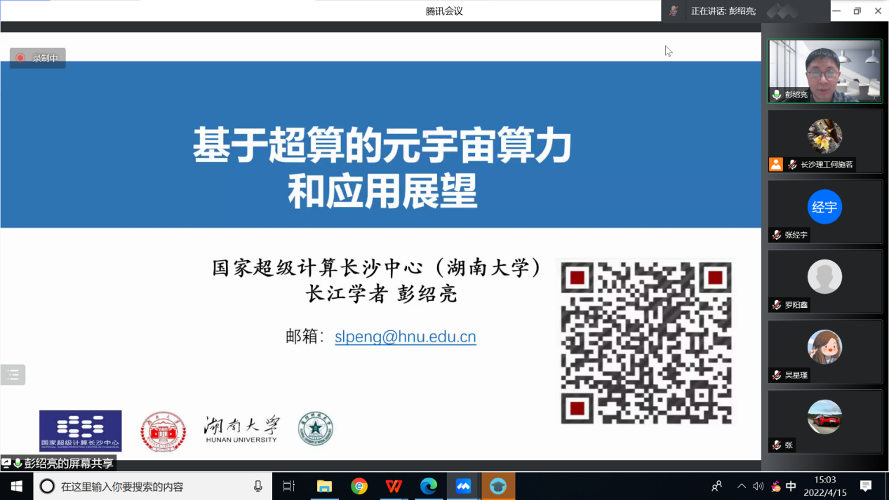 彭绍亮教授全面介绍了元宇宙的概念并分析了目前元宇宙领域的科研动态。元宇宙是一个平行于现实世界,又独立于现实世界的虚拟空间,是映射现实世界的在线虚拟世界,是越来越真实的数字虚拟世界。元宇宙拥有六大特性:持续性、实时性、兼容性、经济属性、可连接性、可创造性。元宇宙至少包括以下要素:身份、朋友、沉浸感、低延迟、多元化、随地、经济系统和文明。元宇宙仍是一个不断发展、演变的概念,现在我们讨论和研究的一些模型和关键技术,包括:虚拟现实、区块链、人工智能、边缘计算、智慧医疗、数字孪生、智能制造等也只是具有元宇宙的某些特性。元宇宙源于现实又超脱于现实,我们现在还只能说元宇宙它具备什么,但仍然不能定义元宇宙它是什么。元宇宙最终的形态应该是多元宇宙融合。不是一个国家和一家公司能够完成元宇宙的实现,而是世界共同完成。元宇宙是一个承载活动的虚拟世界,虚拟世界的人工智能内容生成、图形实时交互显示等离不开算力的支持。超算、云计算和边缘计算等技术为元宇宙提供了算力基础。超强的算力和通信等能力可以支持无边无际的数字环境和海量用户,为基于强化学习的人工智能提供了建模反馈和指导。我们必须整合和重构算力平台,设计“云边端”协同的混合异构AI算力系统,打造元宇宙入口。元宇宙涉及的应用领域包罗万象,从游戏资产、虚拟物品、医疗健康、数字艺术品、NFT等。元宇宙在社交、零售、娱乐、广告、文化、旅行和健康等诸多领域都有着大量的应用场景,包括沉浸式商务、线上协作办公、VR购房、沉浸式教育、建筑、工程和设计等。元宇宙时代“线上+线下”的工作生活方式还会带来新的医疗健康问题,包括慢性病、心理疾病、睡眠障碍、老龄化等。数字疗法和电子药近期也在呈快速增加趋势,患者从医生开具处方获得的可能是某款手机APP、软硬件结合的游戏产品。“数字疗法”使得互联网和科学技术的巨大潜能在医疗行业中完全释放,而2020年疫情的全面爆发,这个特殊的时刻成为了加速了“数字疗法”脚步的契机。未来,我们的医疗可能简单得就像打开微信一样,随时在线,一旦健康遭遇风险,我们的“数字疗法”软件就有一套从防控到治疗的系列解决方案,帮助我们预防、治疗并管理疾病,彻底改变我们求医和健康生活方式。本次报告中,彭绍亮教授针对参会师生的提问做了很多深入的探讨和交流,并鼓励和邀请老师和同学们到国家超级计算长沙中心进行学术学习和交流。