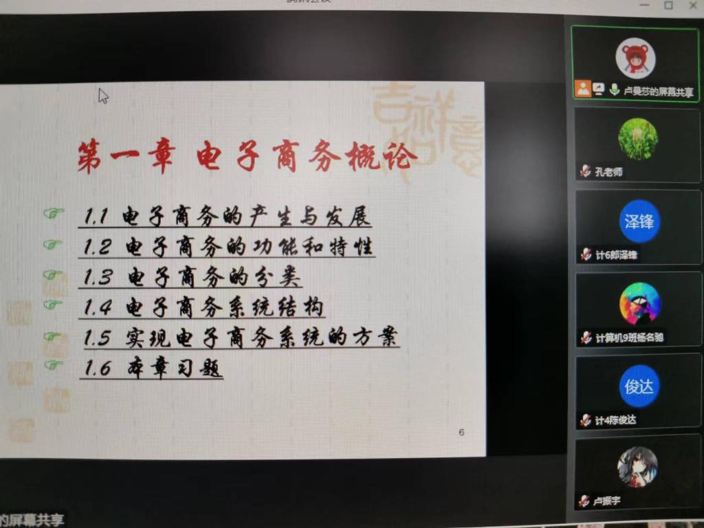 院班子成员与督导专家们在线听课检查中也发现了一些问题:一是个别老师的PPT还存在较大的提升美化空间;二是多数在线课堂未要求学生开启摄像头,不利于老师掌握学生的听课情况,也不便于师生间的互动。专家们建议学院在持续推进老师完善教学材料的过程中,重点关注多媒体课件的制作,可组织学院教师,尤其是青年博士教师集中培训,提高PPT的制作水平,不断改进课堂教学的效果。