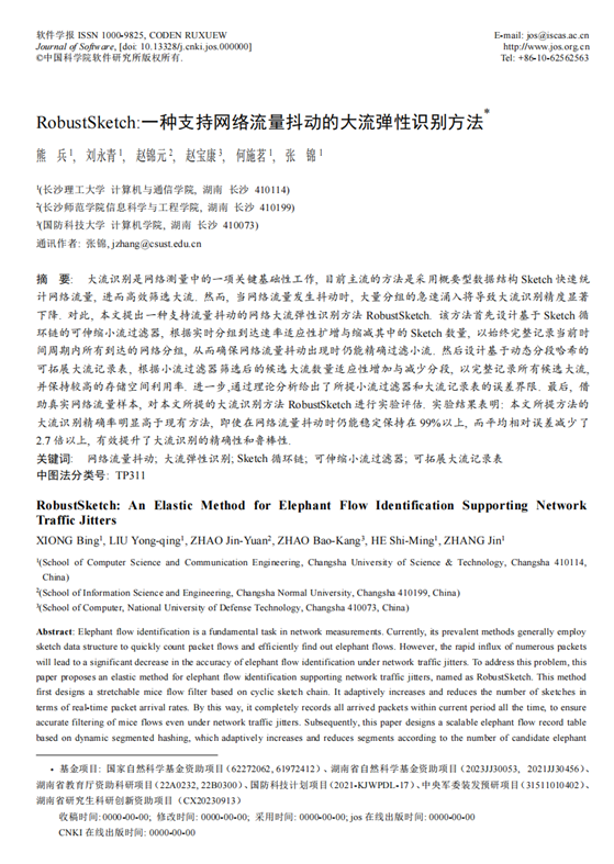 近日,以我院熊兵副教授为第一作者,MG冰球突破官网为第一作者单位的学术论文“RobustSketch:一种支持网络流量抖动的大流弹性识别方法”被软件工程领域的权威期刊《软件学报》录用。《软件学报》致力于介绍计算机科学和计算机软件新理论、新方法和新技术以及学科发展趋势,主要涉及理论计算机科学、算法设计与分析、系统软件与软件工程、数据库技术、计算机网络及其他相关内容的研究。该期刊由中国科学院软件研究所和中国计算机学会联合主办,是CCF A类中文学术期刊。