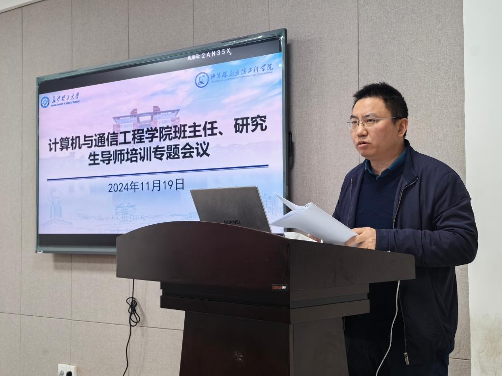 2024年11月19日,计通学院于金盆岭校区九教211教室召开班主任、研究生导师培训专题会议。院党委书记刘朝辉、学院心理辅导员潘枝花、全体班主任、研究生导师参与此次会议。会议由院党委副书记王觊婧主持。
