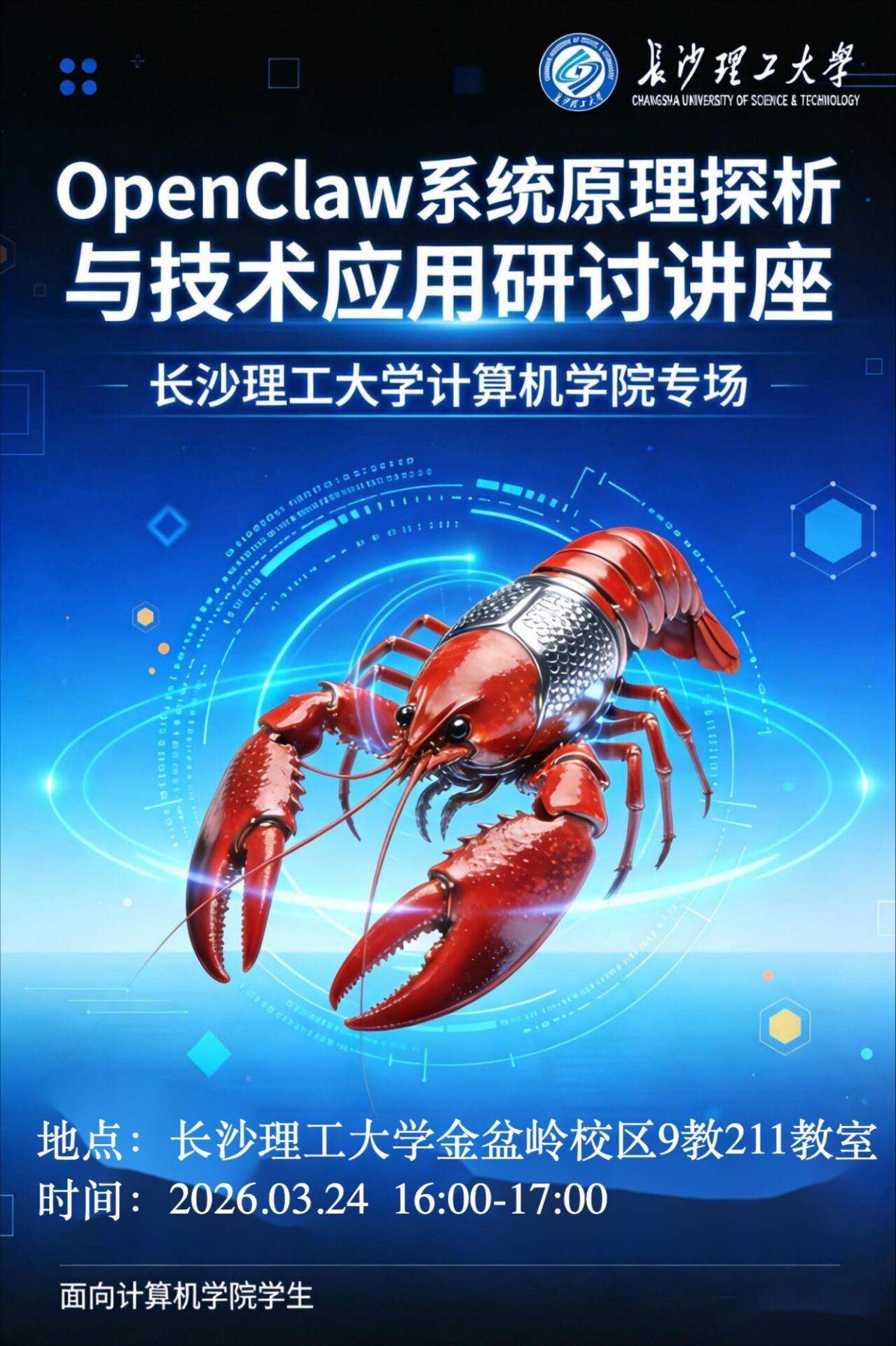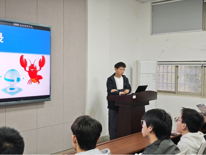 为推动 AI 智能体技术的学习与应用,2026 年 3 月 24 日下午四点,OpenClaw(小龙虾)技术专题研讨会在MG冰球突破官网金盆岭校区 9 教 211 教室成功举办。本次研讨会由优秀研究生张旭担任主讲人,张建明教授,李平教授,张经宇老师出席。