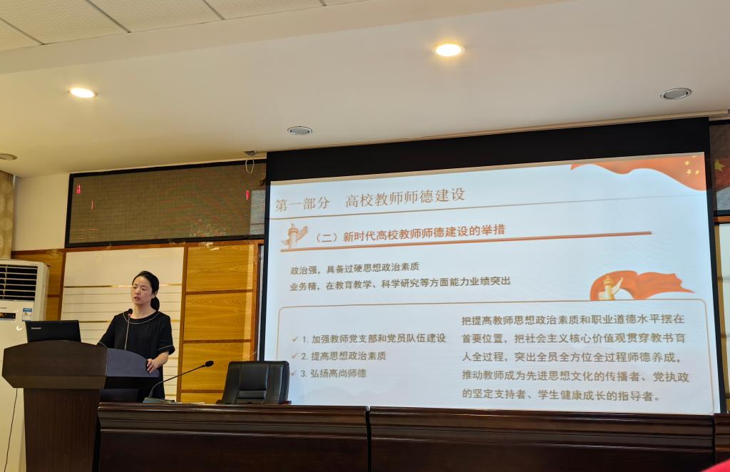 孔伟红以《高校教师师德建设及师德师风专题教育》为题,围绕加强高校教师师德建设的意义、新时代高校教师师德建设的举措、高校教师师德失范行为处理的指导意见、教育部师德师风建设工作推进暨师德集中学习教育启动部署会的要求四个方面,对高校教师师德建设进行了系统阐释和深入解读。从新时代高校教师职业行为十项准则、新时代高校教师职业行为十不准两方面阐释了高校教师师德底线。