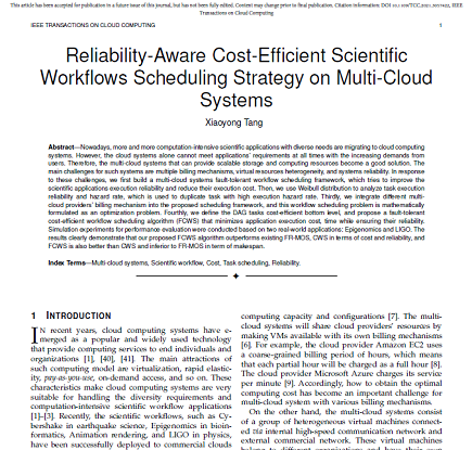 2021年2月5日,我院唐小勇教授以MG冰球突破官网为第一作者单位的论文被《IEEE Transactions on Cloud Computing》录用。该期刊是云计算领域的国际顶级期刊,致力于介绍云计算领域创新研究思路、应用成果和案例,重点关注理论、算法、系统、应用和性能等关键技术问题。《IEEE Transactions on Cloud Computing》由美国电气和电子工程师协会发行,近年来平均影响因子为6.203。