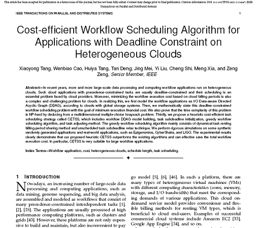 该论文“Cost-efficient Workflow Scheduling Algorithm for Applications with Deadline Constraint on Heterogeneous Clouds”主要针对云计算应用程序具有优先约束任务的调度问题,考虑云计费周期任务共享以最小化计算成本所面临的挑战。其首先将云应用程序建模为I/O数据感知有向无环图(DDAG)。然后,以任务执行成本为最小化为目标,形式化描述此期限受限任务调度问题。通过对多维多项选择背包问题的推导,证明该问题时间复杂度为NP难。第三,提出一种启发式高性价比任务调度策略CETSS,包括工作流DDAG模型建立、任务子截止时间初始化、贪婪工作流调度算法和任务调整方法等。本文提出的算法能有效节省云应用程序执行总成本。