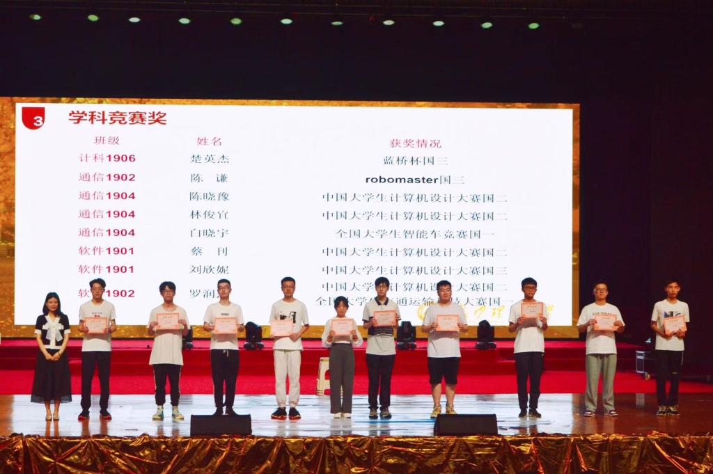大会同时表彰了“学习优秀奖”获得者阳云衡等29人、“班级突出奉献奖”获得者袁云帆等57人、“学科竞赛奖”获得者杭帆等25人、“优秀班级”通信1903班等7个班级、“优秀宿舍”行四B213等4间宿舍。